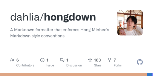 洪 民憙 (Hong Minhee)@lemmy.mlEnglish · 2 months agoHongdown: An opinionated Markdown formatter in Rustplus-squaregithub.comexternal-linkmessage-square0linkfedilinkarrow-up11arrow-down10