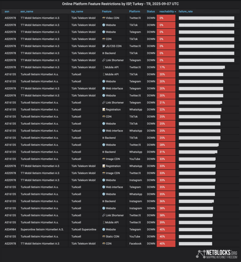 ⚠️ Confirmed: Live metrics show online platforms including X, YouTube, Instagram, Facebook, TikTok, WhatsApp have been restricted in #Turkey on multiple networks; the incident comes as main opposition party CHP calls for rallies after police blockade its Istanbul headquarters