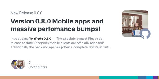 Introducing PinePods 0.8.0 – The absolute biggest Pinepods release to date. Pinepods mobile clients are officially released! Additionally the backend api has gotten a complete rewrite in rust!
